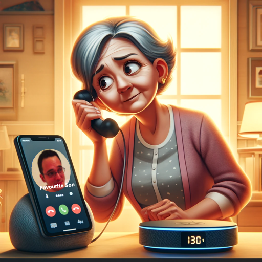 Cartoon of older adult woman on the phone with an incoming video call from her 'Favourite Son' on a smart device.